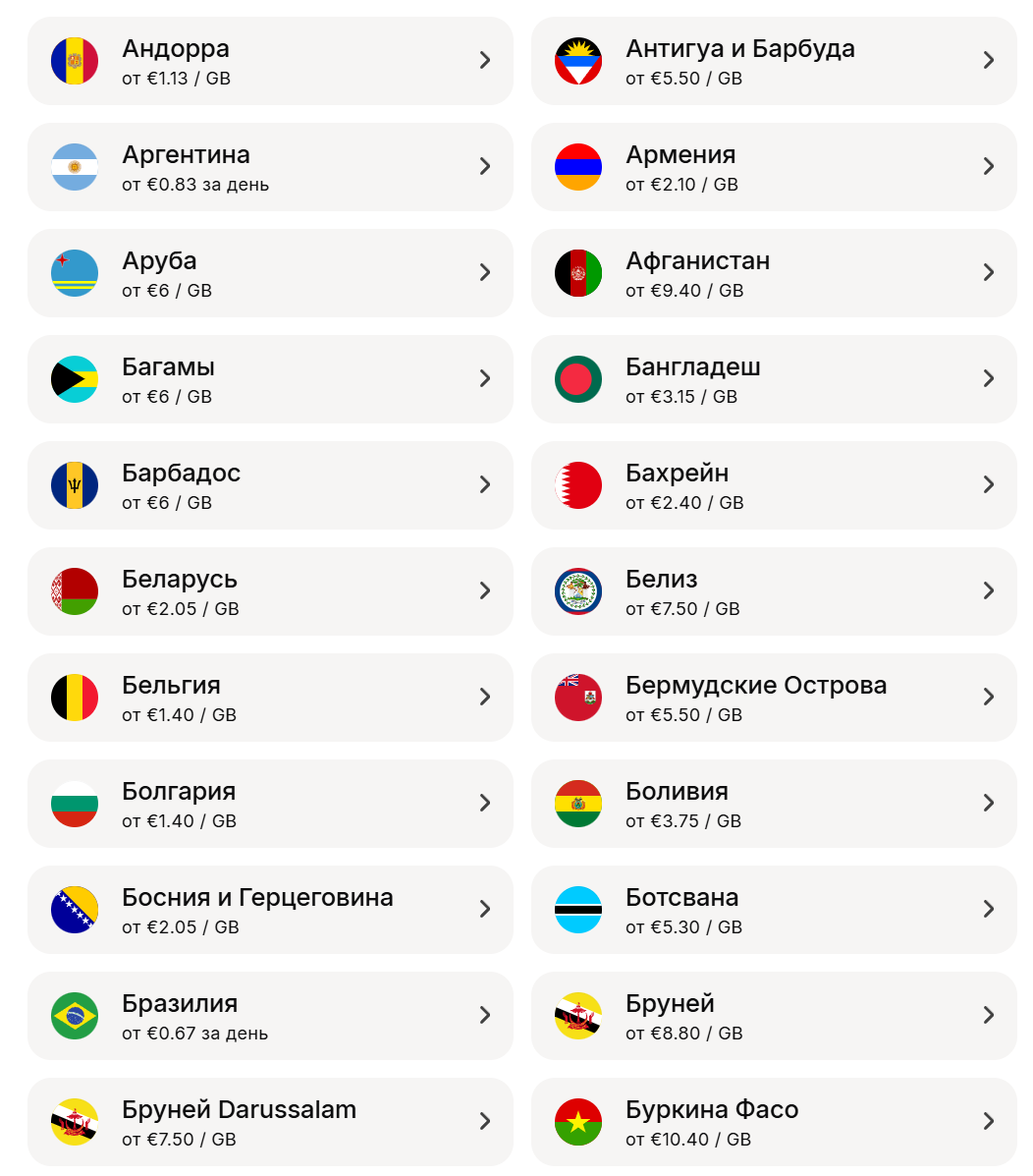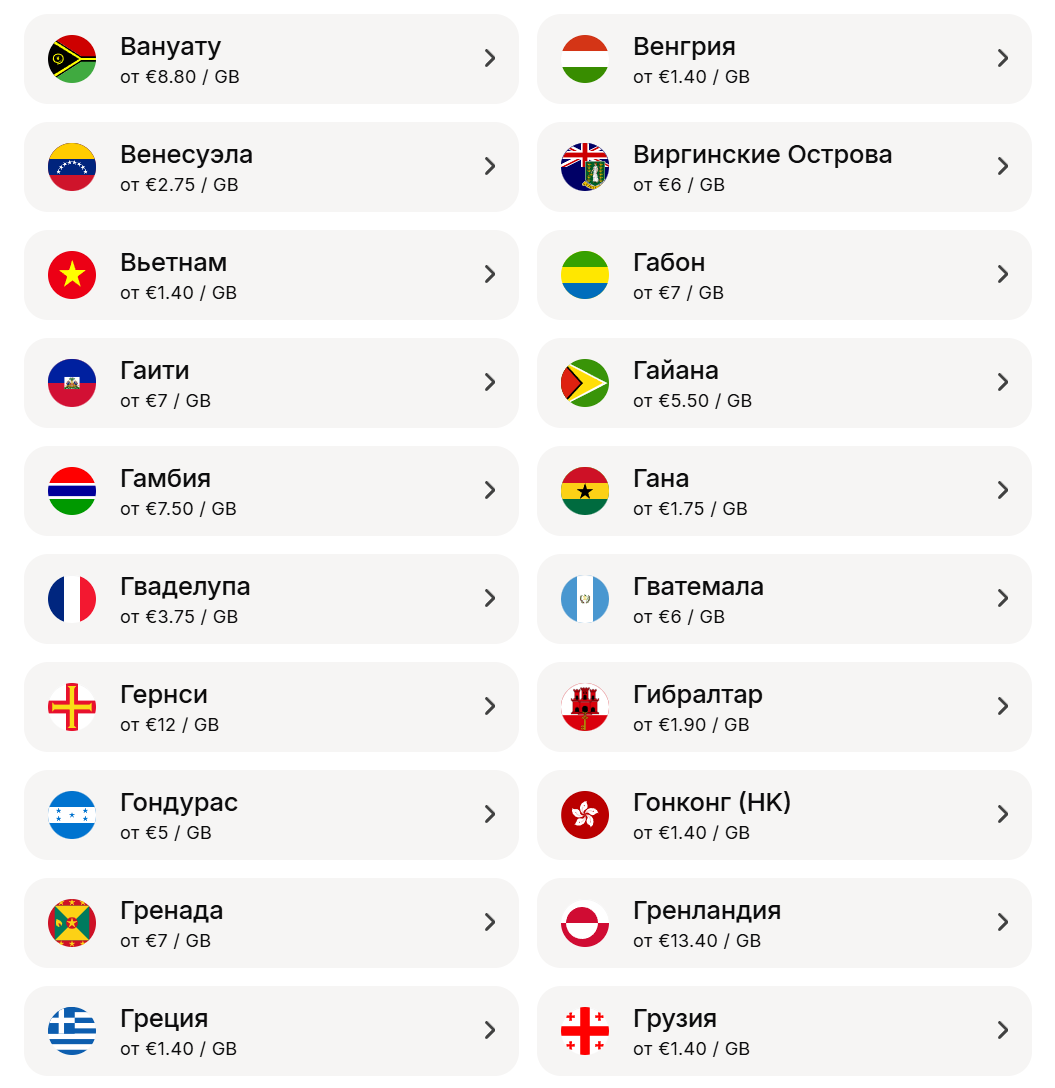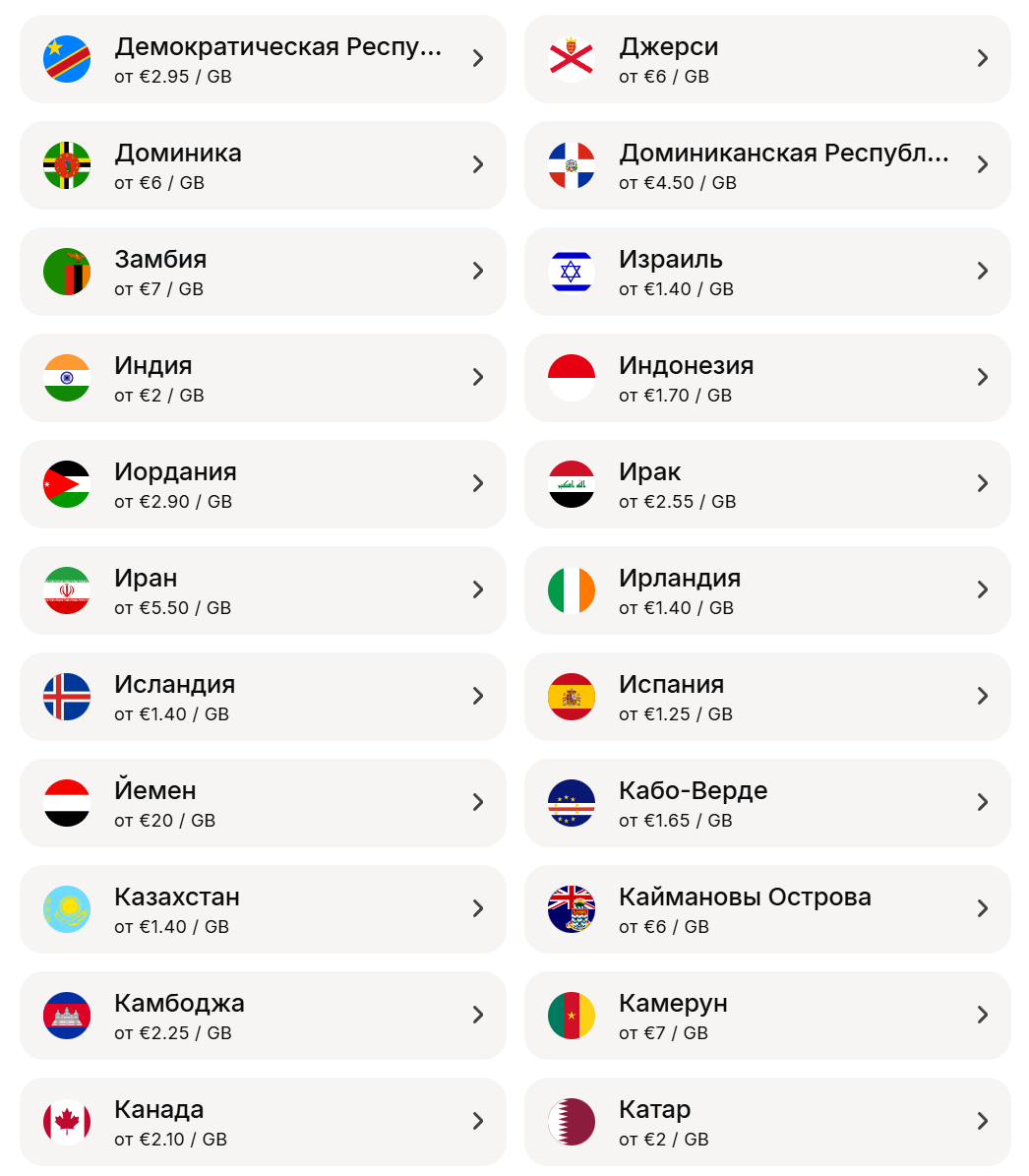 - Страны, в которых использовать Yesim?